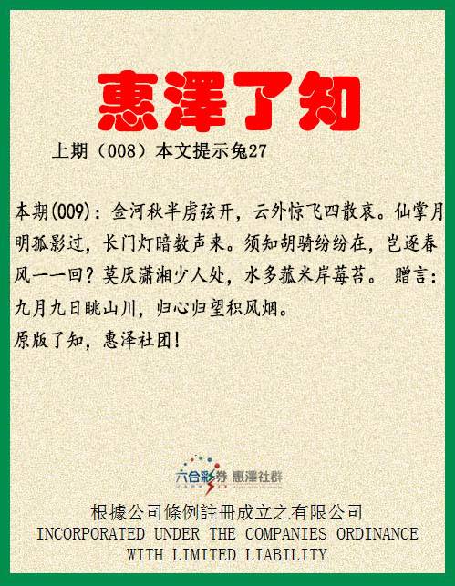 【惠泽了知】008期:本期(008):况有文章山斗。对桐阴、满庭清昼。当年堕地,而今试看,风云奔走。绿野风烟,平泉草木,东山歌酒。待他年,整顿乾坤事了,为先生寿。贈言:大漠沙如雪,燕山月似钩。何当金络脑,快走踏清秋。原版了知,惠泽社团! 【惠泽六肖】:鸡蛇虎猪龙兔 【惠泽三肖】:鸡蛇虎 【惠泽一肖】:鸡 【惠泽特码】:21.33.13.25.16.28.19.31.14.26.03.15 【惠泽平肖】:兔兔兔 【惠泽平尾】:333 |